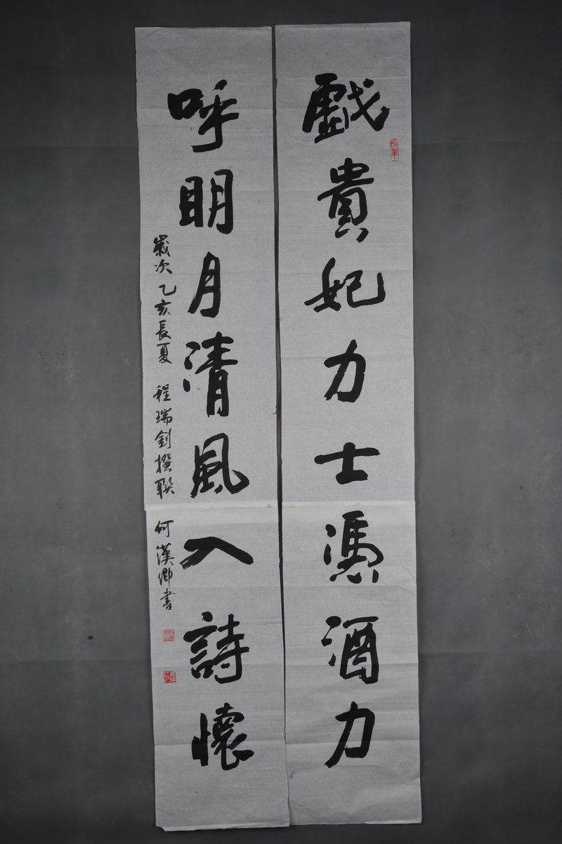 1995年何汉卿行书“戏贵·呼朋”对联