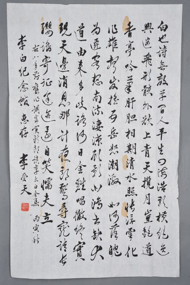 1986年李受天行书寄贺新郎读李太白全集条幅