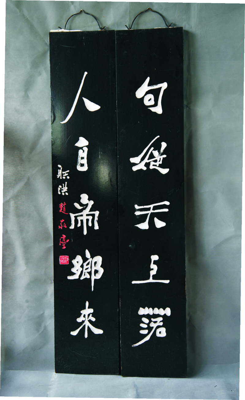 2002年赵敬亭行书“人自帝乡来句从天上落”木刻对联
