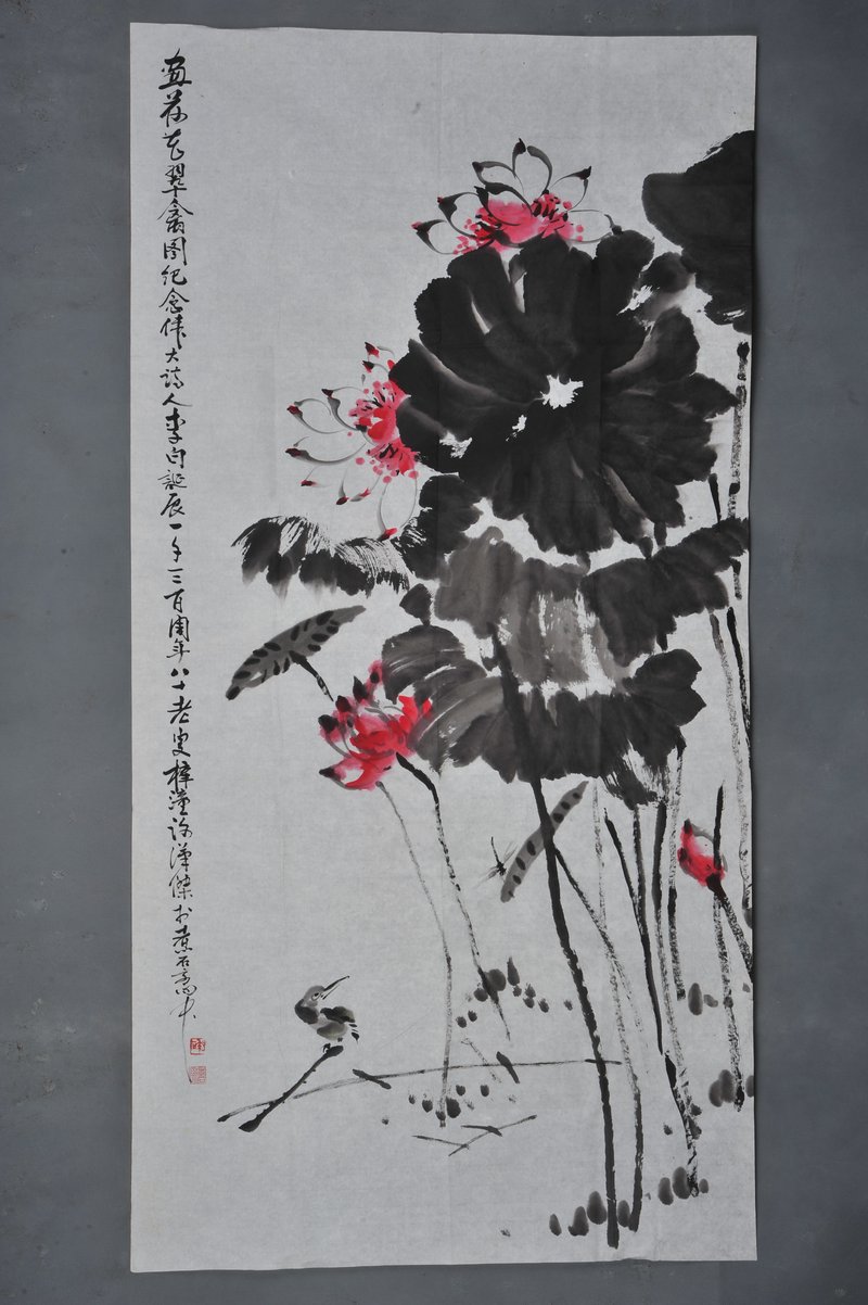 2001年谢汉杰荷花翠禽图条幅