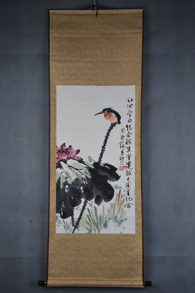 1993年车述祖翠鸟荷花图卷轴