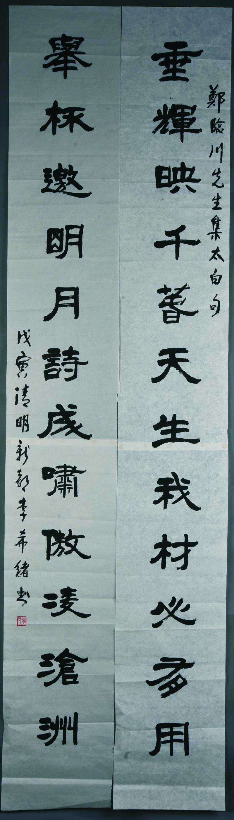 1998年李希绪隶书“垂辉·举杯”对联
