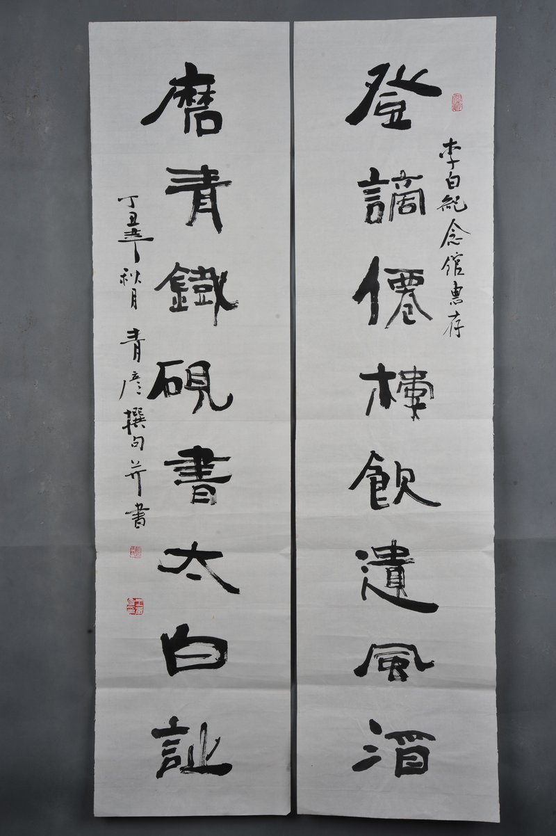 1997年青彦隶书“登谪·磨青”对联