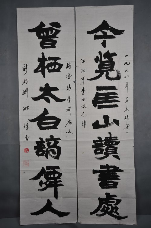 1998年刘叔谅隶书“今览·曾栖”对联