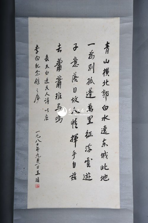 1980年王瑶行书李白诗《送友人》卷轴