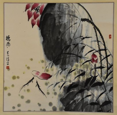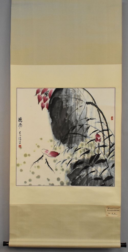 吴休“听雨荷花”卷轴